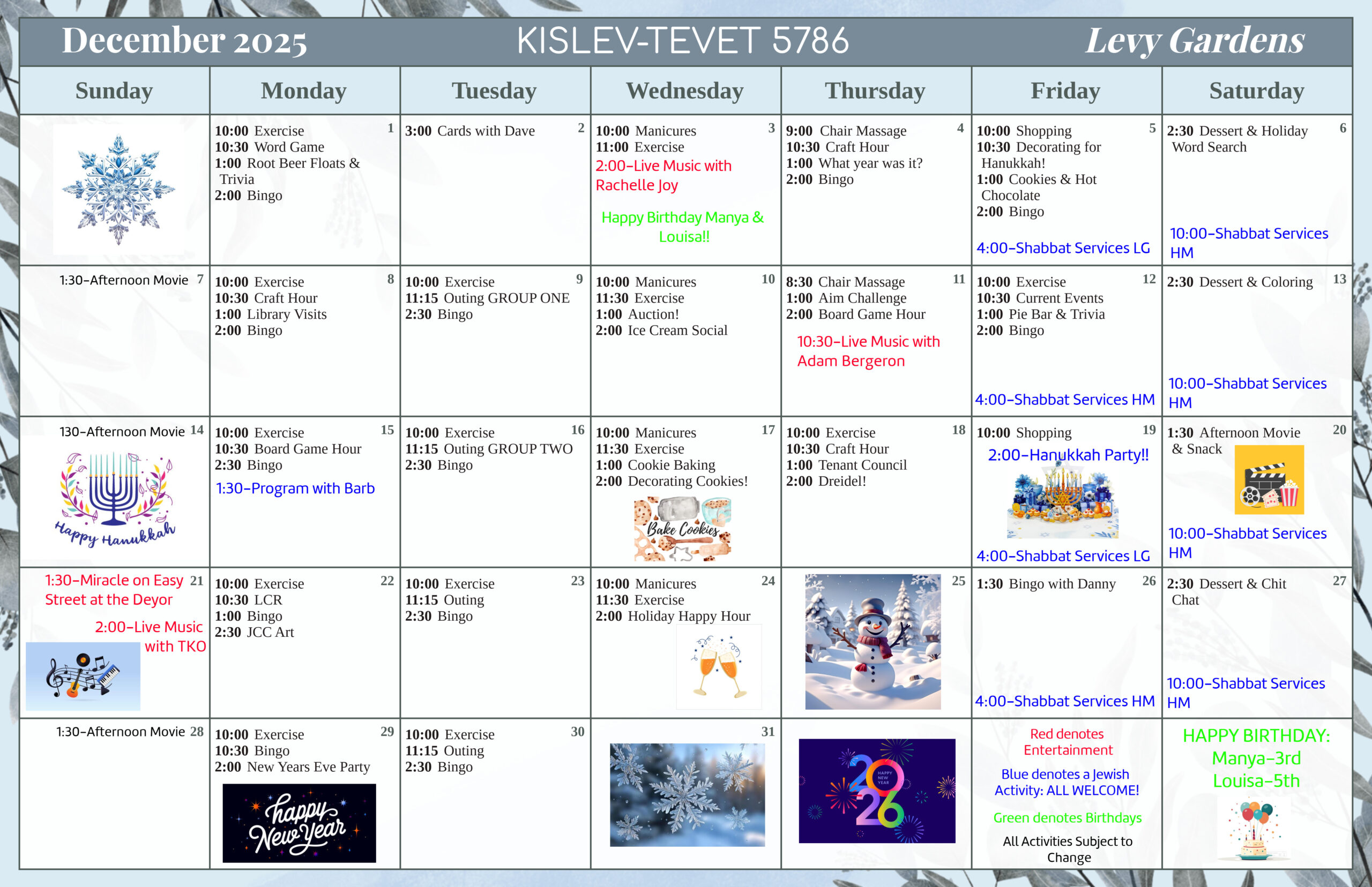 Our faith-based higher standard informs all that we do at Levy Gardens. Everyone is welcome and cared for by our compassionate staff. We understand that frequent communication with families and a variety of programming is important.